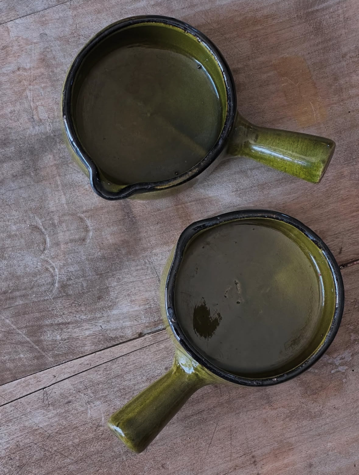Deux petits bols en céramique émaillée, couleur vert olive. Dotés d’un bec verseur et d’une anse, ils sont parfaits pour servir, cuisiner ou détourner en objets déco.